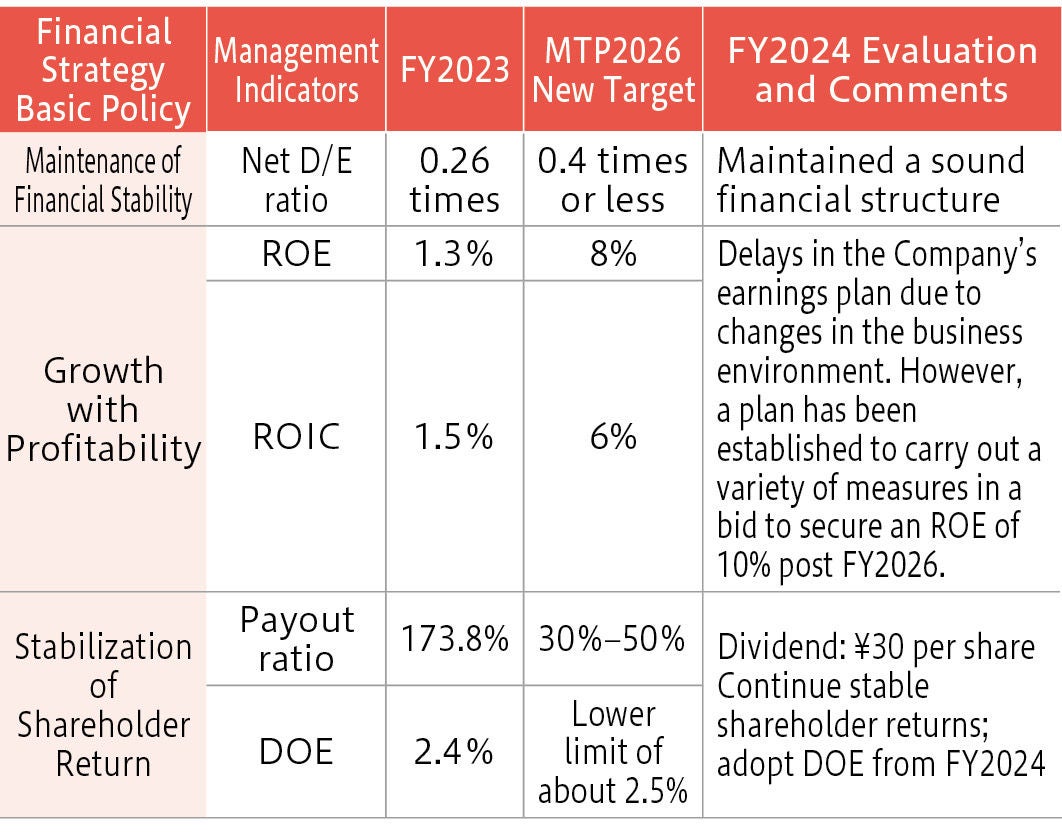 We are acutely aware of the need to secure an ROE that exceeds the cost of capital (an ROE of roughly 8%–9%) if we are to address this issue. To this end, it is vital that we first put in place an earnings structure that reflects the new financial targets set under MTP2026, namely sales of 900 billion yen, operating income of 75 billion yen, and an operating income margin of 8%. Looking at the Group’s growth and expansion endeavors identified in its profitability improvement road map to FY2026, we will work diligently to expand sales of high-profit products, improve our business portfolio, and seize opportunities for growth in burgeoning markets. As a part of our structural reform initiatives, and in addition to engaging in ultra-stable production and increasing efficiency through DX, we will reap the benefits of measures aimed at reorganizing production, including efforts to reform the structure of our European operations. At the same time, we will push forward a raft of effective measures, including the reduction of cross-shareholdings while providing appropriate shareholder returns. By improving the efficiency of our assets, our goal is to lift ROE to 8% in FY2026 and 10% in FY2026.