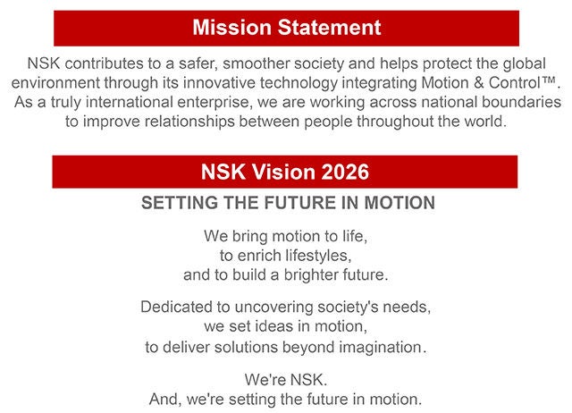 The NSK Corporate Philosophy contains our mission statement: “NSK contributes to a safer, smoother society and helps protect the global environment through its innovative technology integrating Motion & Control™. As a truly international enterprise, we are working across national boundaries to improve relationships between people throughout the world.” In order to realize the corporate philosophy, in 2016, on our 100th anniversary, we established “NSK Vision 2026.” Vision 2026 lays out how we will evolve from 2016-2026, with “setting the future in motion,” as a catchphrase to guide that process of growth and change.