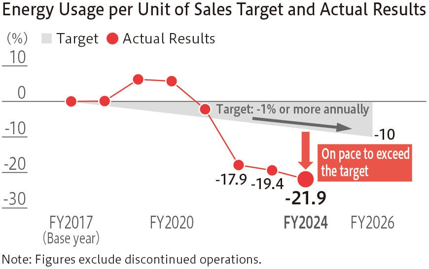 | Energy usage per unit of sales: 10% reduction from FY2017 | 7.7% reduction from FY2017 | 21.9% reduction from FY2017 | 8.8% reduction from FY2017 | ||