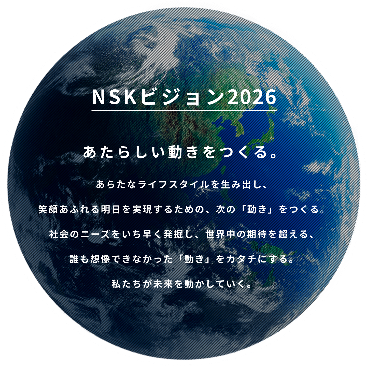未来への目標を達成するため、NSKではありたい姿として「NSKビジョン2026」を策定しました。100年、1000年先も選ばれ続ける企業であるために、「MTP2026(中期経営計画)」では、トライボロジーとデジタルの融合による価値創出で、持続可能な社会の発展に貢献し、社会から必要・信頼される企業を目指しています。