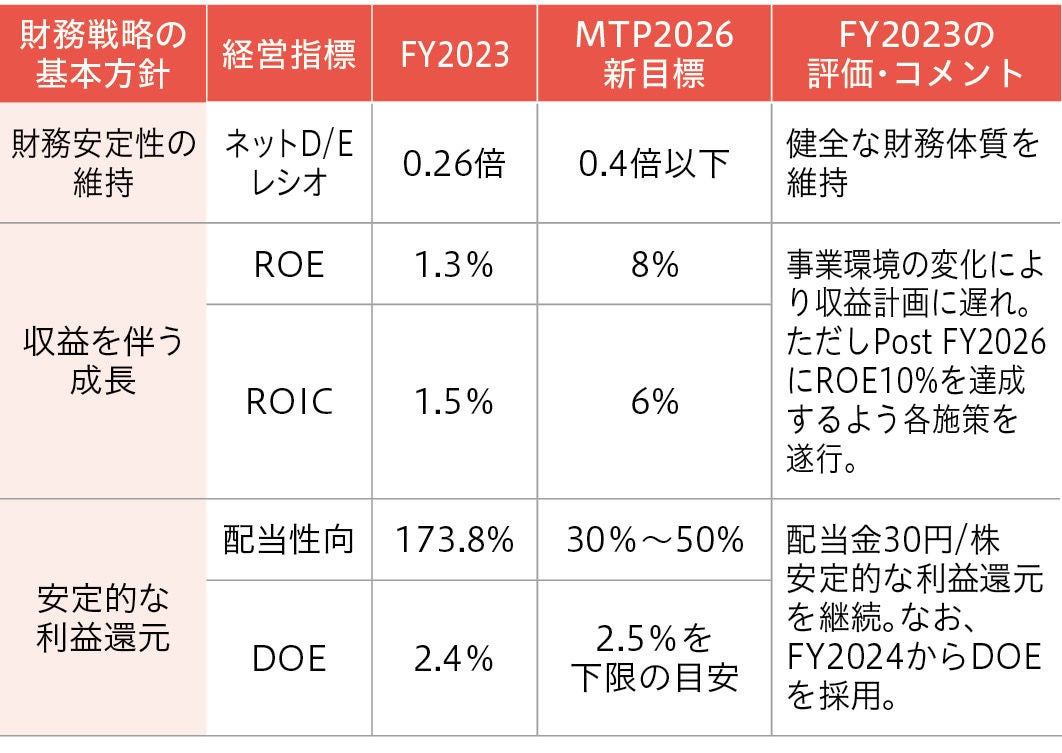 この現状を超えていくためには、株主資本コスト(当社は概ね8%から9%と認識)を上回るROEを達成することが必要と考えます。そのために、まずはMTP2026で新たに設定した財務目標である売上高9,000億円、営業利益750億円、営業利益率8%の収益体質づくりを進めていきます。FY2026に向けた収益改善ロードマップにおいて、成長・拡大の面では、高収益品の拡販とポートフォリオの改善を進めるとともに成長市場での拡大機会を取り込んでいきます。そして体質改善の面では、超安定化生産やDXによる効率化に加えて欧州構造改革をはじめとした生産再編を遂行し、それらの効果を刈り取っていきます。また収益改善施策と並行して、政策保有株式の縮減や株主還元などを効果的に実施し、資産効率の向上を図ることでROEをFY2026に8%へ引き上げ、FY2026の先には10%を実現させたいと考えます。