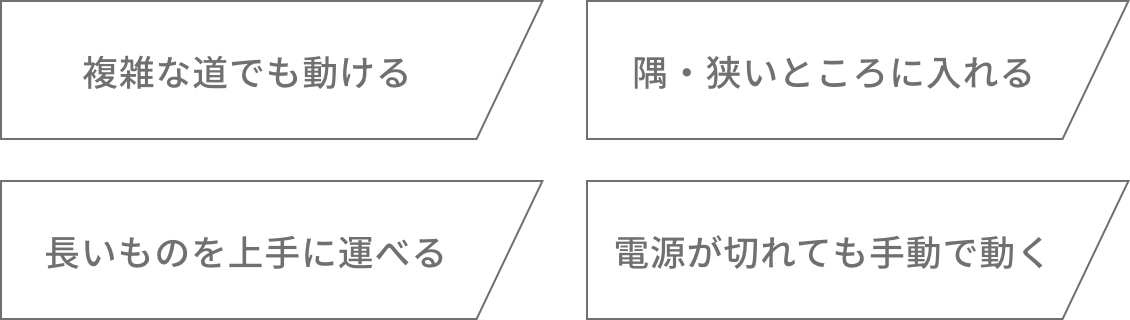従来苦手とされていた様々な素材の床面や凹凸のある路面、隙間・段差なども走行ができ、幅広いシーンに適応できます。