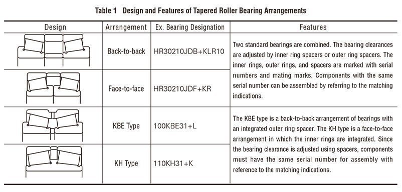 TRBs can take radial loads and axial loads in one direction. When load is applied, the axial component generated inside the bearing generally requires the use of two opposed bearings (similar to angular contact ball bearings) or double-row bearings. Spacers are used to adjust the inner and outer rings in the axial direction to achieve the proper internal clearance. Since they are separable, the inner ring (cone) assemblies and outer rings (cups) can be mounted independently.